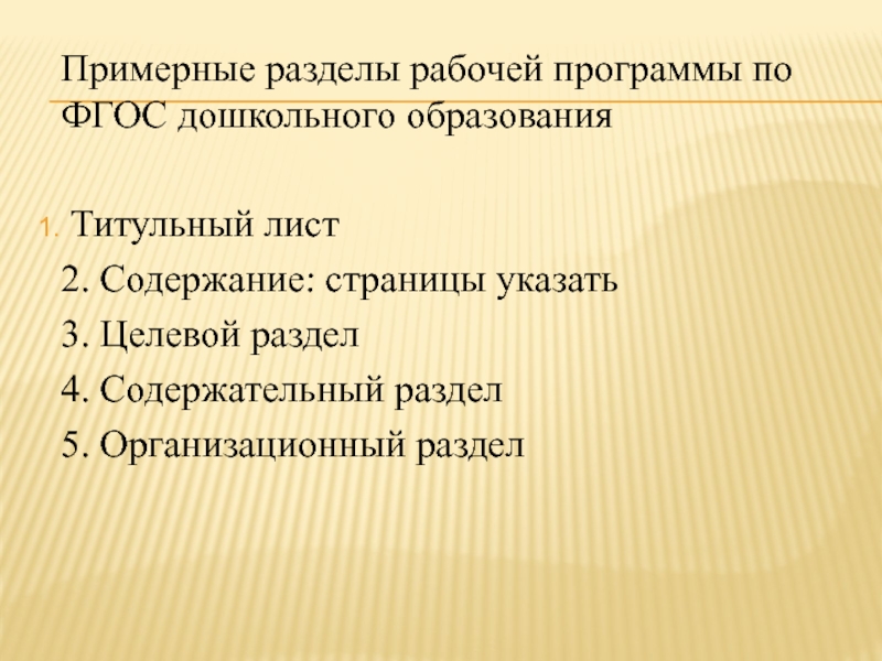 Слайд 5Примерные разделы рабочей программы по ФГОС дошкольного образования