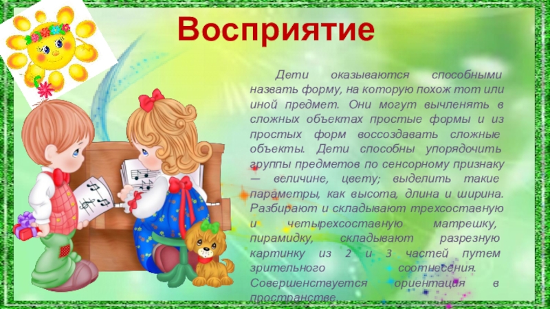 иной предмет. Они могут вычленять в сложных объектах простые формы и из простых форм воссоздавать сложные объекты. Дети способны упорядочить группы предметов по сенсорному признаку — величине, цвету; выделить такие параметры, как высота, длина и ширина. Разбирают и складывают трехсоставную и четырехсоставную матрешку, пирамидку, складывают разрезную картинку из 2 и 3 частей путем зрительного соотнесения. Совершенствуется ориентация в пространстве.