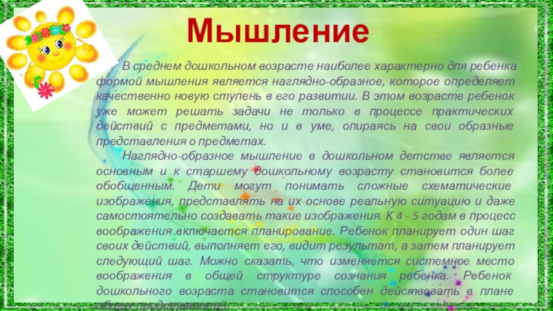Наглядно-образное мышление в дошкольном детстве является основным и к старшему дошкольному возрасту становится более обобщенным. Дети могут понимать сложные схематические изображения, представлять на их основе реальную ситуацию и даже самостоятельно создавать такие изображения. К 4 - 5 годам в процесс воображения включается планирование. Ребенок планирует один шаг своих действий, выполняет его, видит результат, а затем планирует следующий шаг. Можно сказать, что изменяется системное место воображения в общей структуре сознания ребенка. Ребенок дошкольного возраста становится способен действовать в плане общих представлений.