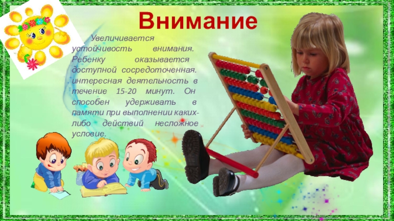 Увеличивается устойчивость внимания. Ребенку оказывается доступной сосредоточенная. интересная деятельность в