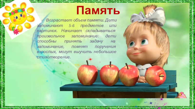 Возрастает объем памяти. Дети запоминают 5-6 предметов или картинок. Начинает