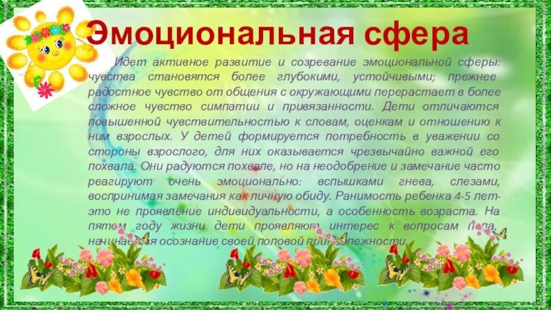 глубокими, устойчивыми; прежнее радостное чувство от общения с окружающими перерастает в более сложное чувство симпатии и привязанности. Дети отличаются повышенной чувствительностью к словам, оценкам и отношению к ним взрослых. У детей формируется потребность в уважении со стороны взрослого, для них оказывается чрезвычайно важной его похвала. Они радуются похвале, но на неодобрение и замечание часто реагируют очень эмоционально: вспышками гнева, слезами, воспринимая замечания как личную обиду. Ранимость ребенка 4-5 лет- это не проявление индивидуальности, а особенность возраста. На пятом году жизни дети проявляют интерес к вопросам пола, начинается осознание своей половой принадлежности.