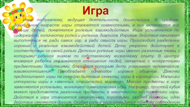 Игра по-прежнему, ведущая деятельность дошкольника. В среднем дошкольном возрасте игры