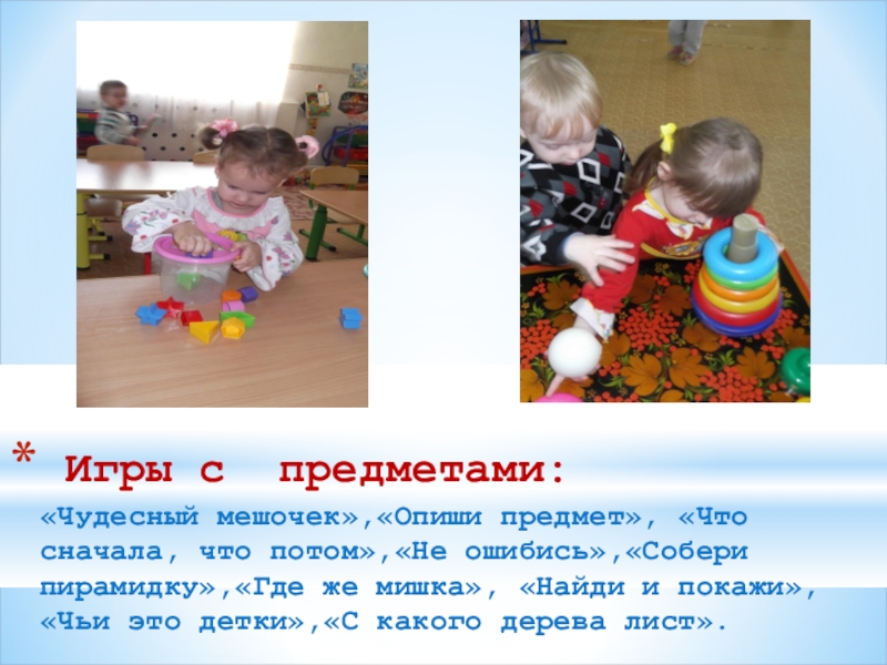 «Чудесный мешочек»,«Опиши предмет», «Что сначала, что потом»,«Не ошибись»,«Собери