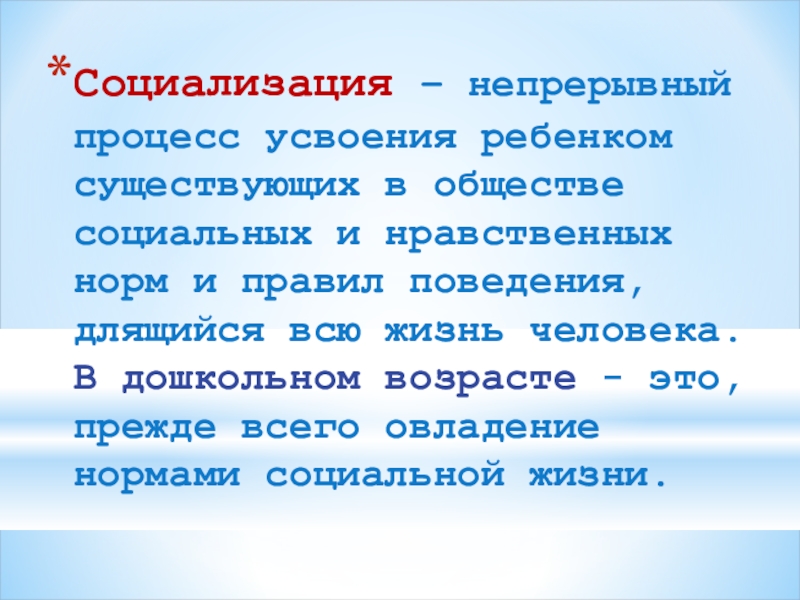 нравственных норм и правил поведения, длящийся всю жизнь человека. В дошкольном возрасте - это, прежде всего овладение нормами социальной жизни.