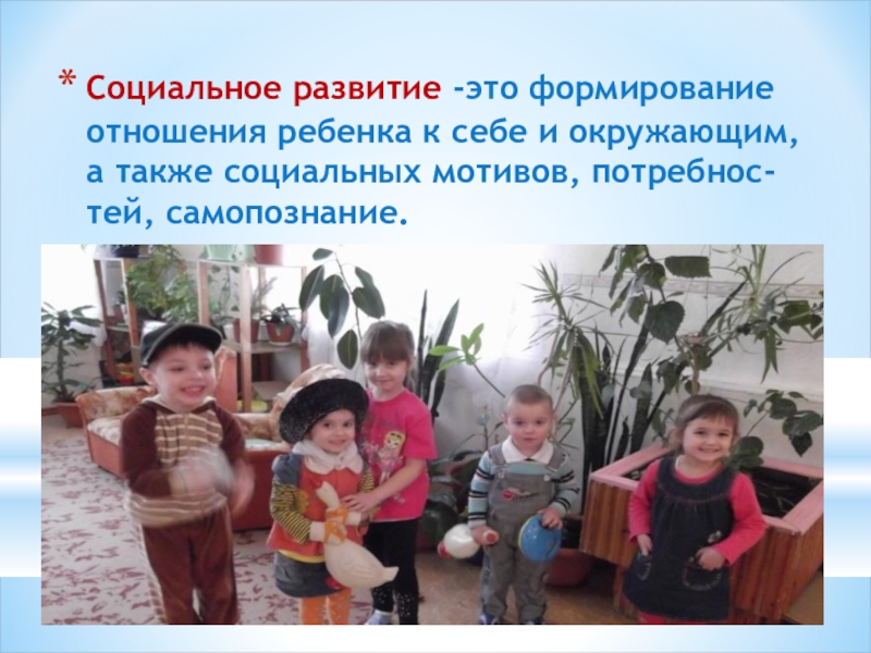 Слайд 6Социальное развитие -это формирование отношения ребенка к себе и окружающим, а