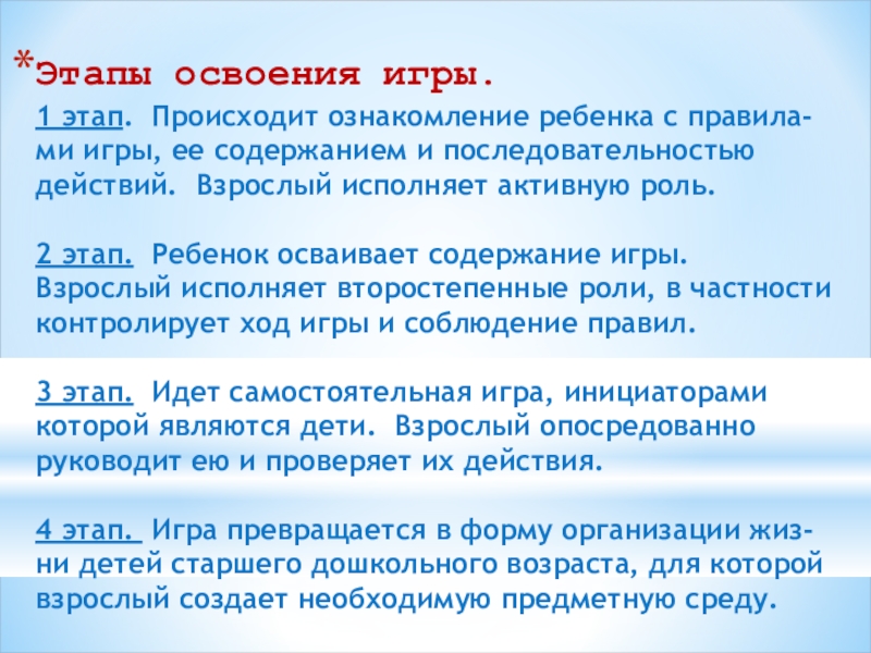 4 этап. Игра превращается в форму организации жиз-ни детей старшего дошкольного возраста, для которой взрослый создает необходимую предметную среду.