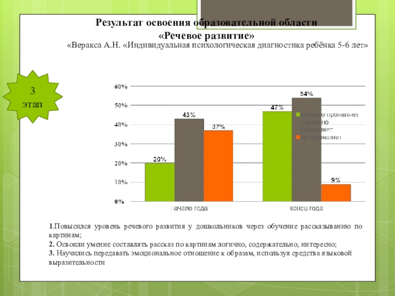 1.Повысился уровень речевого развития у дошкольников через обучение рассказыванию по картинам;