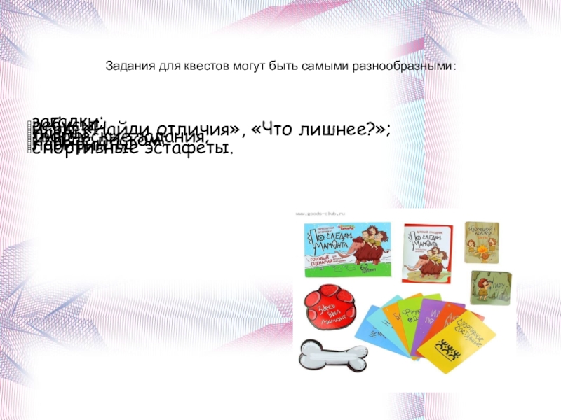 Слайд 8Задания для квестов могут быть самыми разнообразными: