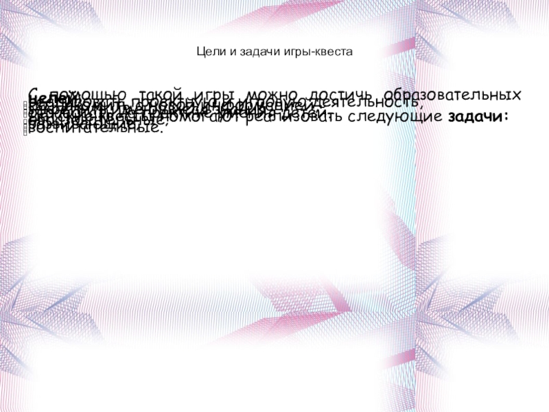 Цели и задачи игры-квестаС помощью такой игры можно достичь образовательных целей:реализовать проектную и игровую деятельность,познакомить с новой