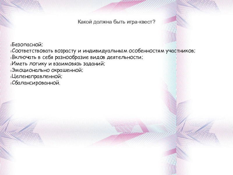 Какой должна быть игра-квест?Безопасной;Соответствовать возрасту и индивидуальным особенностям участников;Включать в себя разнообразие видов деятельности;Иметь логику и взаимовязь