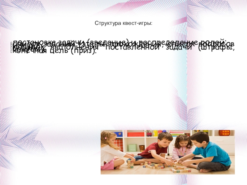 Структура квест-игры:постановка задачи (введение) и распределение ролей;список заданий (этапы прохождения, список вопросов и т. д.);порядок выполнения поставленной