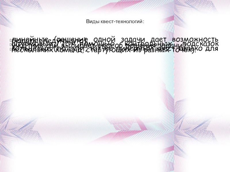 Виды квест-технологий:линейные (решение одной задачи дает возможность решать следующую);штурмовые (с помощью контрольных подсказок участник сам выбирает способ