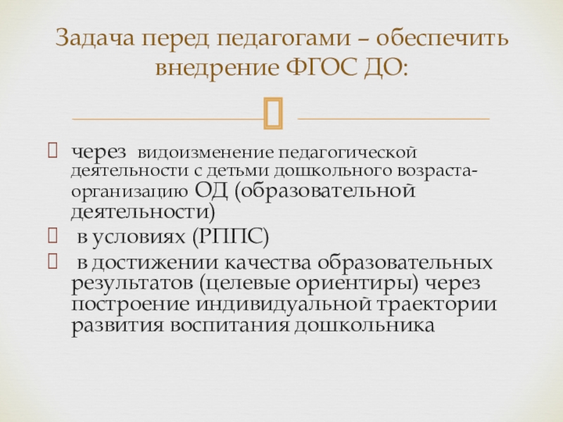 Задача перед педагогами – обеспечить внедрение ФГОС ДО: