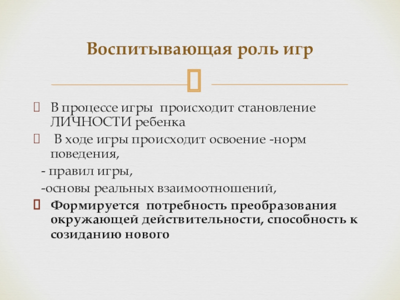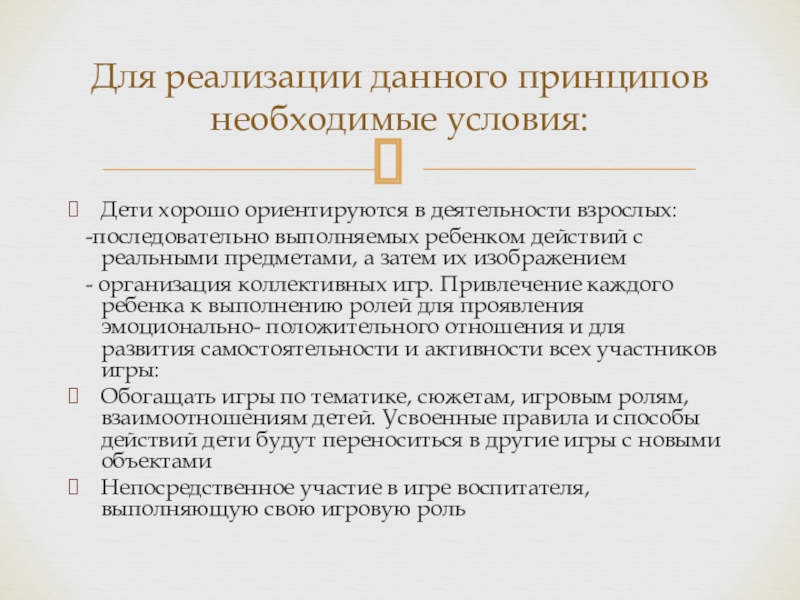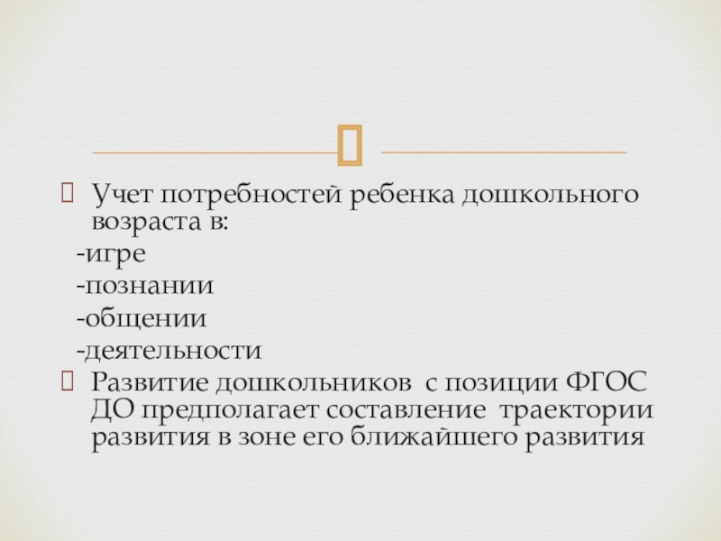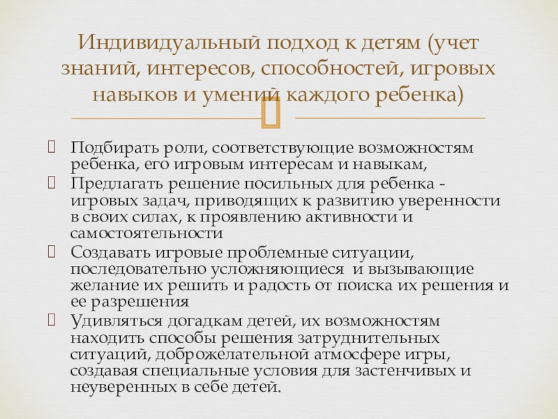 Индивидуальный подход к детям (учет знаний, интересов, способностей, игровых навыков и умений каждого ребенка)