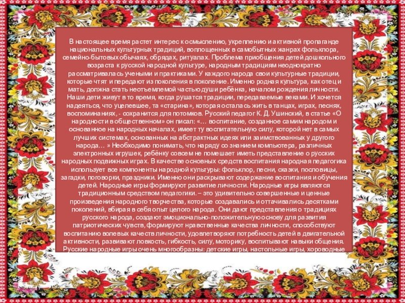 национальных культурных традиций, воплощенных в самобытных жанрах фольклора, семейно-бытовых обычаях, обрядах, ритуалах. Проблема приобщения детей дошкольного возраста к русской народной культуре, народным традициям неоднократно рассматривалась учеными и практиками. У каждого народа свои культурные традиции, которые чтят и передают из поколения в поколение. Именно родная культура, как отец и мать, должна стать неотъемлемой частью души ребёнка, началом рождения личности. Наши дети живут в то время, когда рушатся традиции, передаваемые веками. И хочется надеяться, что уцелевшее, та «старина», которая осталась жить в танцах, играх, песнях, воспоминаниях, - сохранится для потомков. Русский педагог К. Д. Ушинский, в статье «О народности в общественном» он писал: «… воспитание, созданное самим народом и основанное на народных началах, имеет ту воспитательную силу, которой нет в самых лучших системах, основанных на абстрактных идеях или заимствованных у другого народа… » Необходимо понимать, что наряду со знанием компьютера, различных электронных игрушек, ребёнку совсем не помешает иметь представление о русских народных подвижных играх. В качестве основных средств воспитания народная педагогика использует все компоненты народной культуры: фольклор, песни, сказки, пословицы, загадки, поговорки, праздники. Именно они раскрывают содержание воспитания и обучения детей. Народные игры формируют развитие личности. Народные игры являются традиционным средством педагогики. – это удивительно совершенные и ценные произведения народного творчества, которые создавались и оттачивались десятками поколений, вбирая в себя опыт целого народа. Они дают представления о традициях русского народа, создают эмоционально-положительную основу для развития патриотических чувств, формируют нравственные качества личности, способствуют воспитанию волевых качеств личности, удовлетворяют потребность детей в двигательной активности, развивают ловкость, гибкость, силу, моторику, воспитывают навыки общения. Русские народные игры очень многообразны: детские игры, настольные игры, хороводные игры для взрослых с народными песнями, прибаутками, плясками.