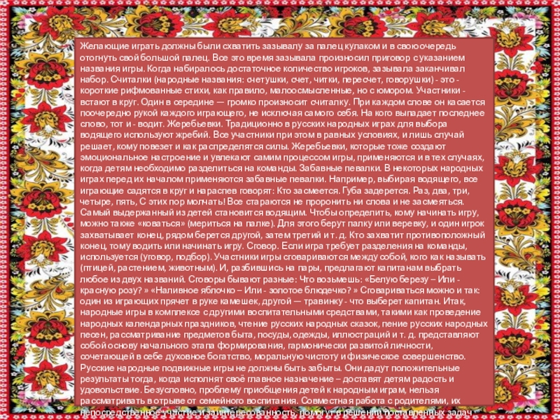 свою очередь отогнуть свой большой палец. Все это время зазывала произносил приговор с указанием названия игры. Когда набиралось достаточное количество игроков, зазывала заканчивал набор. Считалки (народные названия: счетушки, счет, читки, пересчет, говорушки) - это -короткие рифмованные стихи, как правило, малоосмысленные, но с юмором. Участники - встают в круг. Один в середине — громко произносит считалку. При каждом слове он касается поочередно рукой каждого играющего, не исключая самого себя. На кого выпадает последнее слово, тот и - водит. Жеребьевки. Традиционно в русских народных играх для выбора водящего используют жребий. Все участники при этом в равных условиях, и лишь случай решает, кому повезет и как распределятся силы. Жеребьевки, которые тоже создают эмоциональное настроение и увлекают самим процессом игры, применяются и в тех случаях, когда детям необходимо разделиться на команды. Забавные певалки. В некоторых народных играх перед их началом применяются забавные певалки. Например, выбирая водящего, все играющие садятся в круг и нараспев говорят: Кто засмеется. Губа задерется. Раз, два, три, четыре, пять, С этих пор молчать! Все стараются не проронить ни слова и не засмеяться. Самый выдержанный из детей становится водящим. Чтобы определить, кому начинать игру, можно также «коваться» (мериться на палке). Для этого берут палку или веревку, и один игрок захватывает конец, рядом берется другой, затем третий и т. д. Кто захватит противоположный конец, тому водить или начинать игру. Сговор. Если игра требует разделения на команды, используется (уговор, подбор). Участники игры сговариваются между собой, кого как называть (птицей, растением, животным). И, разбившись на пары, предлагают капитанам выбрать любое из двух названий. Сговоры бывают разные: Что возьмешь: «Белую березу – Или - красную розу? » «Наливное яблочко – Или - золотое блюдечко? » Сговариваться можно и так: один из играющих прячет в руке камешек, другой — травинку - что выберет капитан. Итак, народные игры в комплексе с другими воспитательными средствами, такими как проведение народных календарных праздников, чтение русских народных сказок, пение русских народных песен, рассматривание предметов быта, посуды, одежды, иллюстраций и т. д. представляют собой основу начального этапа формирования, гармонически развитой личности, сочетающей в себе духовное богатство, моральную чистоту и физическое совершенство. Русские народные подвижные игры не должны быть забыты. Они дадут положительные результаты тогда, когда исполнят своё главное назначение – доставят детям радость и удовольствие. Безусловно, проблему приобщения детей к народным играм, нельзя рассматривать в отрыве от семейного воспитания. Совместная работа с родителями, их непосредственное участие и заинтересованность, помогут в решении поставленных задач
