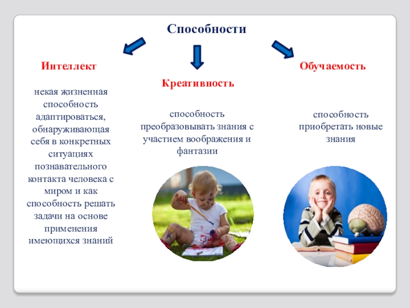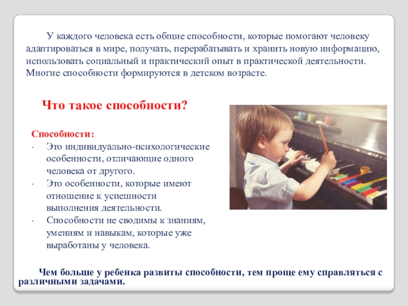 У каждого человека есть общие способности, которые помогают человеку адаптироваться в мире, получать, перерабатывать и хранить новую информацию, использовать социальный и практический опыт в практической деятельности. Многие способности формируются в детском возрасте.