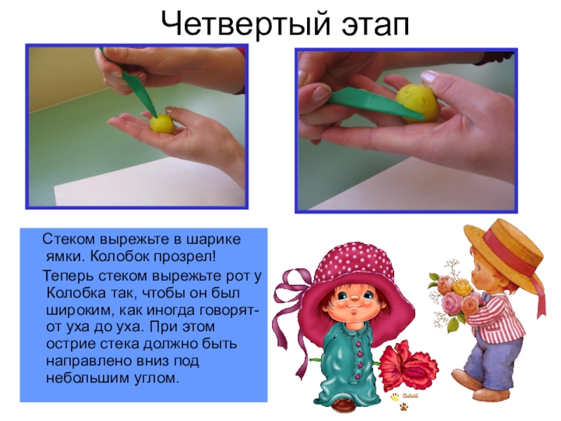 Четвертый этап  Стеком вырежьте в шарике ямки. Колобок прозрел!  Теперь стеком вырежьте рот у Колобка