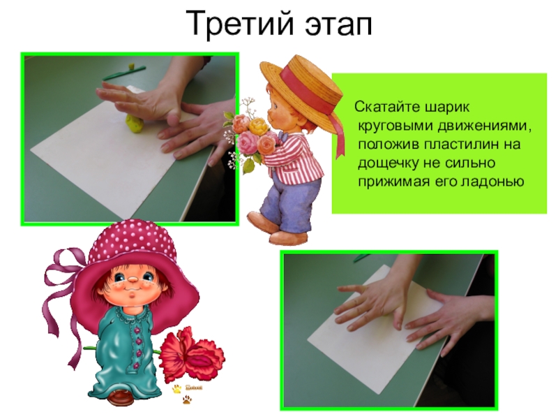 Третий этап    Скатайте шарик круговыми движениями, положив пластилин на дощечку не сильно прижимая его