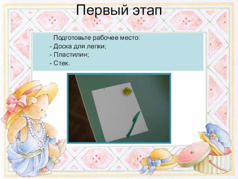 Первый этап     Подготовьте рабочее место:    - Доска для лепки;