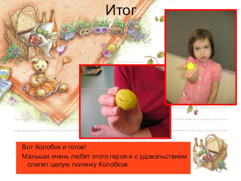 Итог  Вот Колобок и готов! Малыши очень любят этого героя и с удовольствием слепят целую полянку