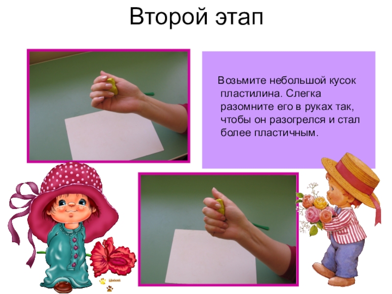 Второй этап    Возьмите небольшой кусок пластилина. Слегка разомните его в руках так, чтобы он
