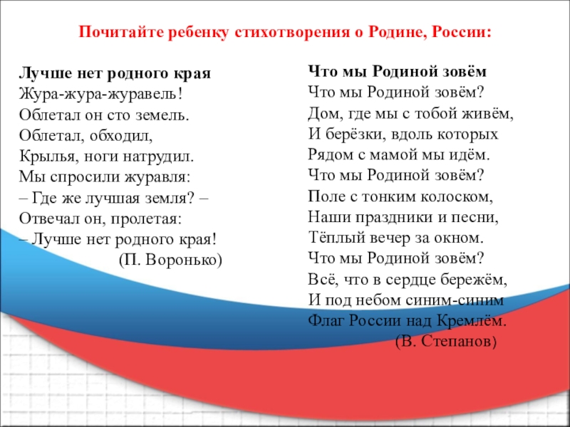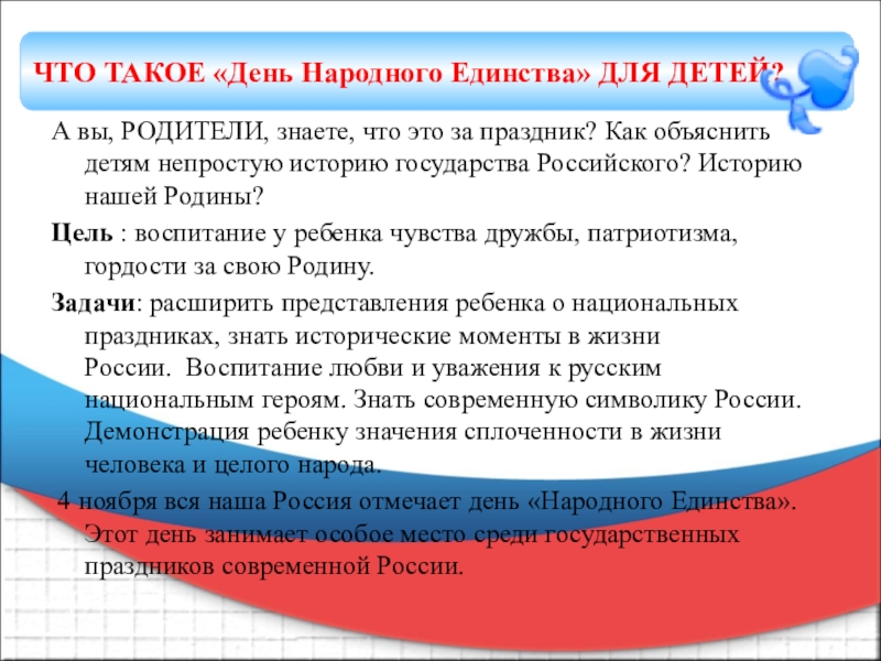 Задачи: расширить представления ребенка о национальных праздниках, знать исторические моменты в жизни России. Воспитание любви и уважения к русским национальным героям. Знать современную символику России. Демонстрация ребенку значения сплоченности в жизни человека и целого народа.