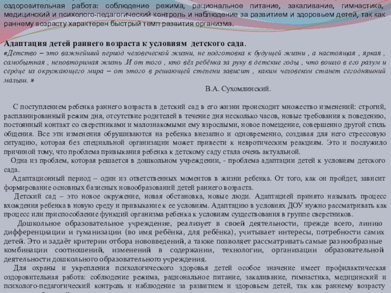 Для охраны и укрепления психологического здоровья детей особое значение имеет профилактическая оздоровительная работа: соблюдение режима, рациональное питание, закаливание, гимнастика, медицинский и психолого-педагогический контроль и наблюдение за развитием и здоровьем детей, так как раннему возрасту характерен быстрый темп развития организма.