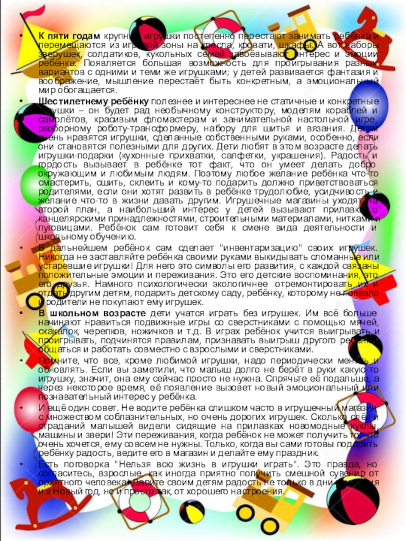 Слайд 3К пяти годам крупные игрушки постепенно перестают занимать ребёнка и перемещаются