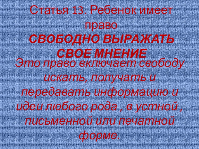 Статья 13. Ребенок имеет право  СВОБОДНО ВЫРАЖАТЬ СВОЕ МНЕНИЕЭто право включает свободу искать, получать и передавать