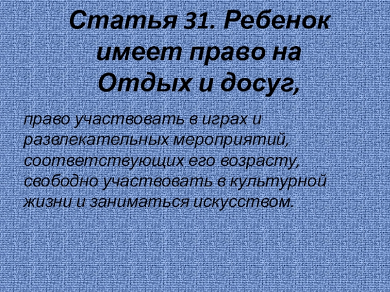 Слайд 6Статья 31. Ребенок имеет право на Отдых и досуг,