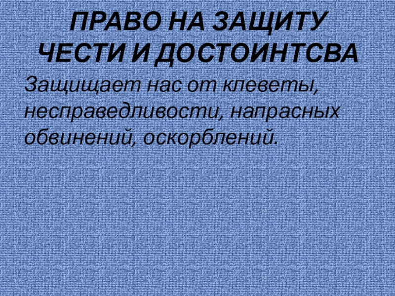 ПРАВО НА ЗАЩИТУ ЧЕСТИ И ДОСТОИНТСВАЗащищает нас от клеветы, несправедливости, напрасных обвинений, оскорблений.