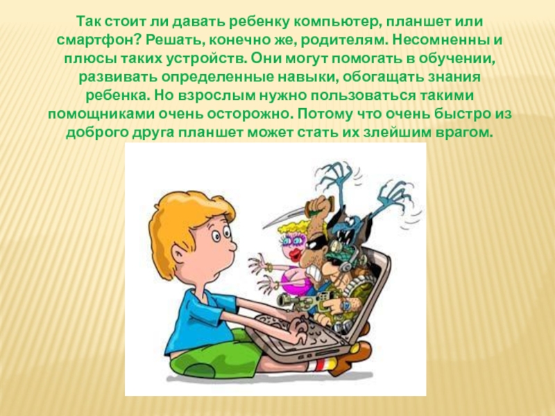 Слайд 16Так стоит ли давать ребенку компьютер, планшет или смартфон? Решать, конечно же,