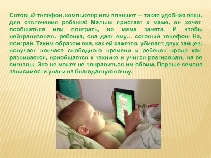 ребенка! Малыш пристает к маме, он хочет пообщаться или поиграть, но мама занята. И чтобы нейтрализовать ребенка, она дает ему… сотовый телефон: На, поиграй. Таким образом она, как ей кажется, убивает двух зайцев: получает полчаса свободного времени и ребенок вроде как развивается, приобщается к технике и учится реагировать на ее сигналы. Это не может не понравиться им обоим. Первые семена зависимости упали на благодатную почву.
