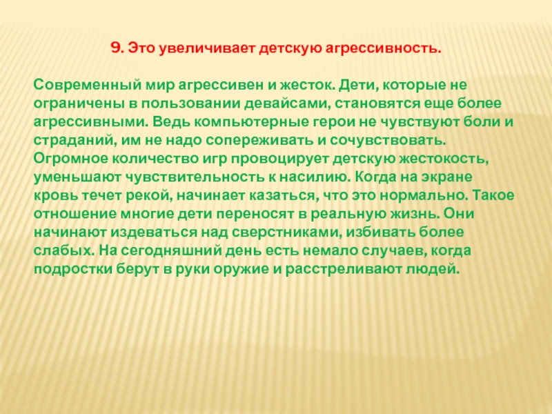 Огромное количество игр провоцирует детскую жестокость, уменьшают чувствительность к насилию. Когда на экране кровь течет рекой, начинает казаться, что это нормально. Такое отношение многие дети переносят в реальную жизнь. Они начинают издеваться над сверстниками, избивать более слабых. На сегодняшний день есть немало случаев, когда подростки берут в руки оружие и расстреливают людей.
