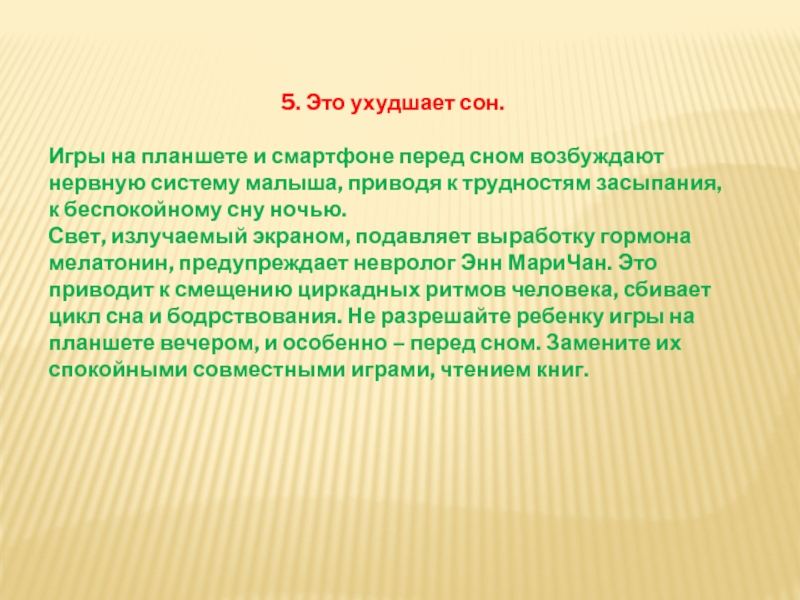 Свет, излучаемый экраном, подавляет выработку гормона мелатонин, предупреждает невролог Энн МариЧан. Это приводит к смещению циркадных ритмов человека, сбивает цикл сна и бодрствования. Не разрешайте ребенку игры на планшете вечером, и особенно – перед сном. Замените их спокойными совместными играми, чтением книг.