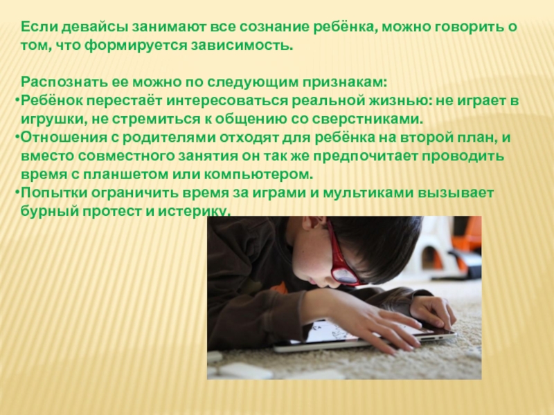 Слайд 17Если девайсы занимают все сознание ребёнка, можно говорить о том, что