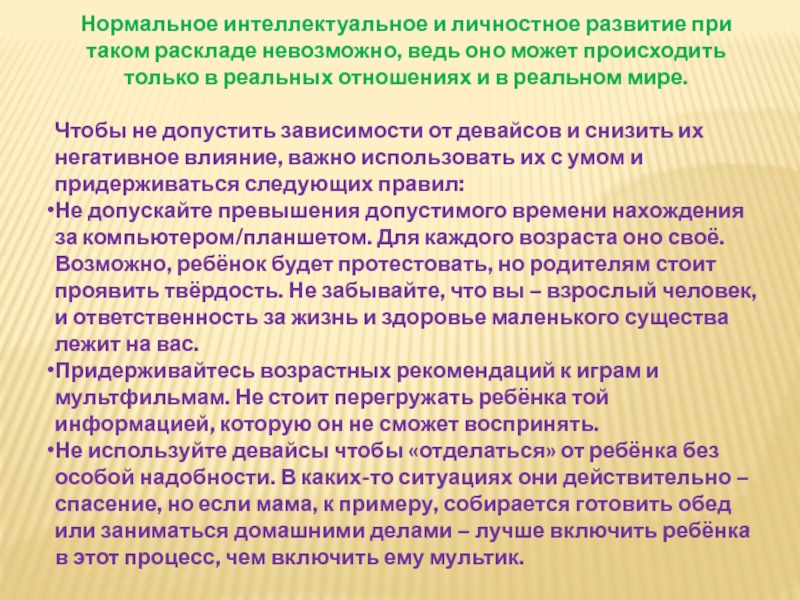 Слайд 18Нормальное интеллектуальное и личностное развитие при таком раскладе невозможно, ведь оно