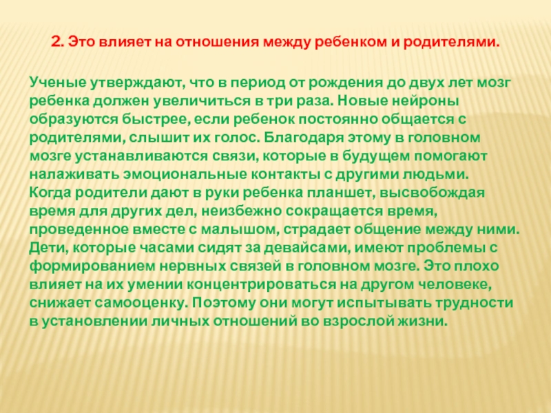 Слайд 72. Это влияет на отношения между ребенком и родителями.