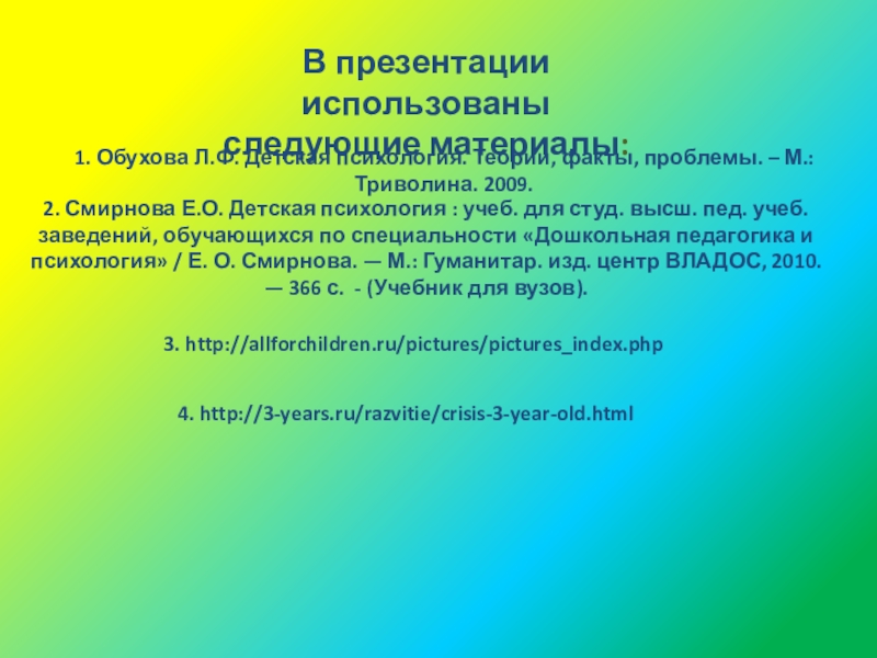 2. Смирнова Е.О. Детская психология : учеб. для студ. высш. пед. учеб. заведений, обучающихся по специальности «Дошкольная педагогика и психология» / Е. О. Смирнова. — М.: Гуманитар. изд. центр ВЛАДОС, 2010. — 366 с. - (Учебник для вузов).