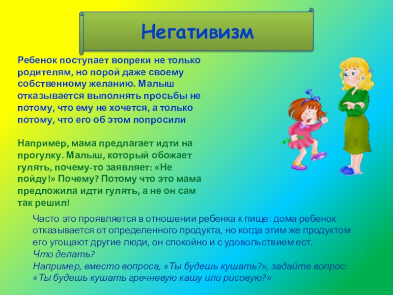 Например, мама предлагает идти на прогулку. Малыш, который обожает гулять, почему-то заявляет: «Не пойду!» Почему? Потому что это мама предложила идти гулять, а не он сам так решил!