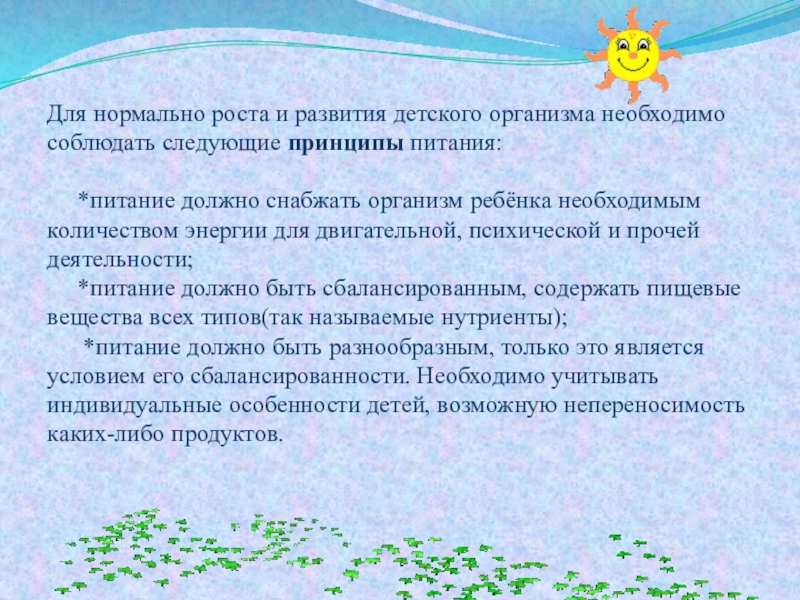 Слайд 3Для нормально роста и развития детского организма необходимо соблюдать следующие принципы