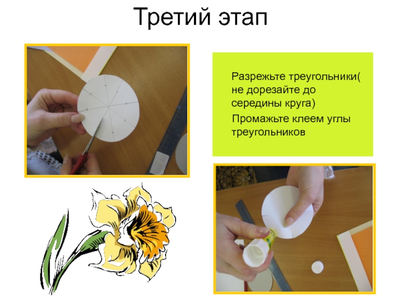 Третий этап   Разрежьте треугольники( не дорезайте до середины круга)   Промажьте клеем углы треугольников