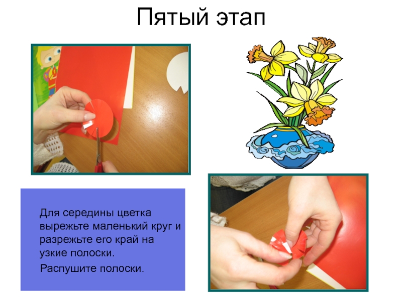 Пятый этап     Для середины цветка вырежьте маленький круг и разрежьте его край на