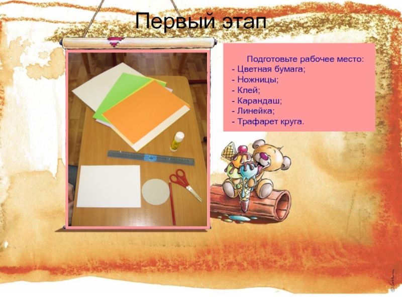 Первый этап Подготовьте рабочее место: - Цветная бумага; - Ножницы; - Клей; - Карандаш; - Линейка; - Трафарет круга.