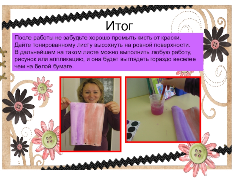 Итог После работы не забудьте хорошо промыть кисть от краски.Дайте тонированному листу высохнуть на ровной поверхности.В дальнейшем