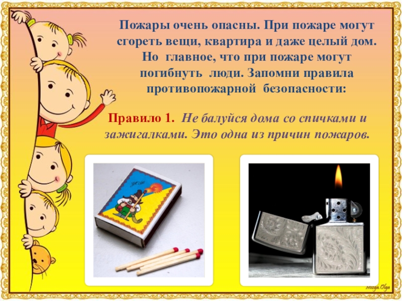 Пожары очень опасны. При пожаре могут сгореть вещи, квартира и даже целый дом. Но главное, что при пожаре могут погибнуть люди. Запомни правила противопожарной безопасности: