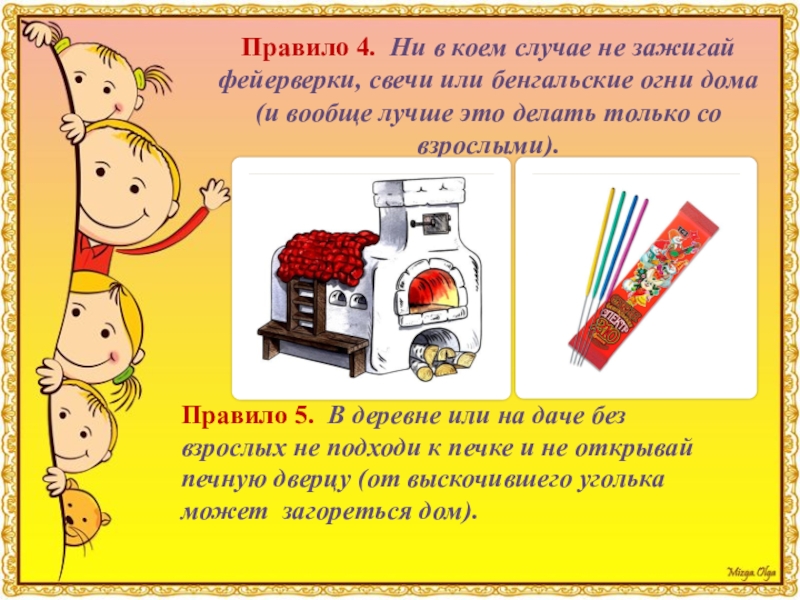 Правило 5. В деревне или на даче без взрослых не подходи к печке и не открывай печную дверцу (от выскочившего уголька может загореться дом).