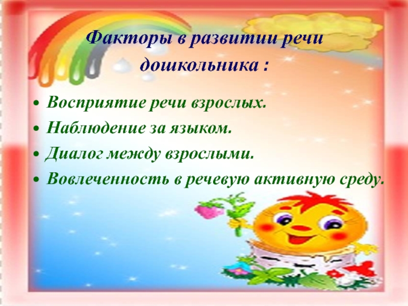 Факторы в развитии речи дошкольника :  Восприятие речи взрослых.Наблюдение за языком.Диалог между взрослыми.Вовлеченность в речевую